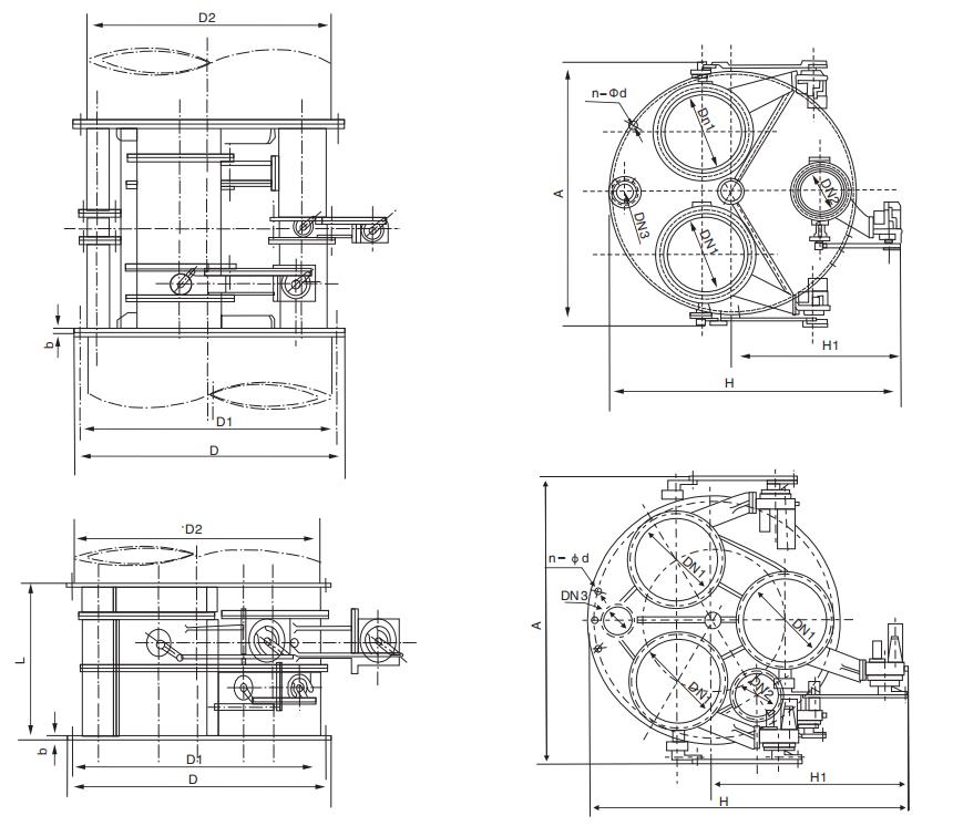 型號 D D1 L b n-Φd A A1 Η H1 閥門配制 許用流量(m3/h) 重量(kg) 對應(yīng) 管道